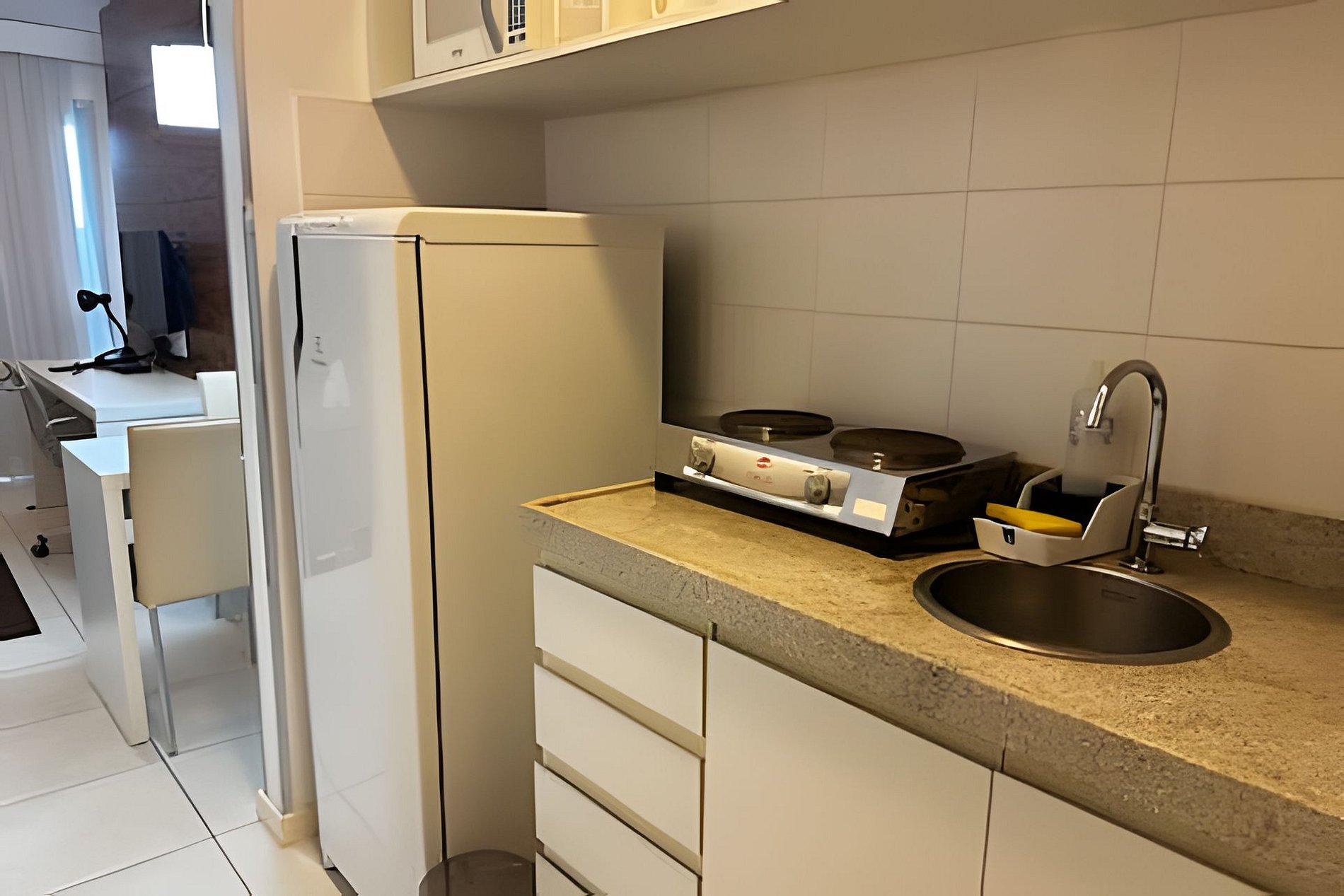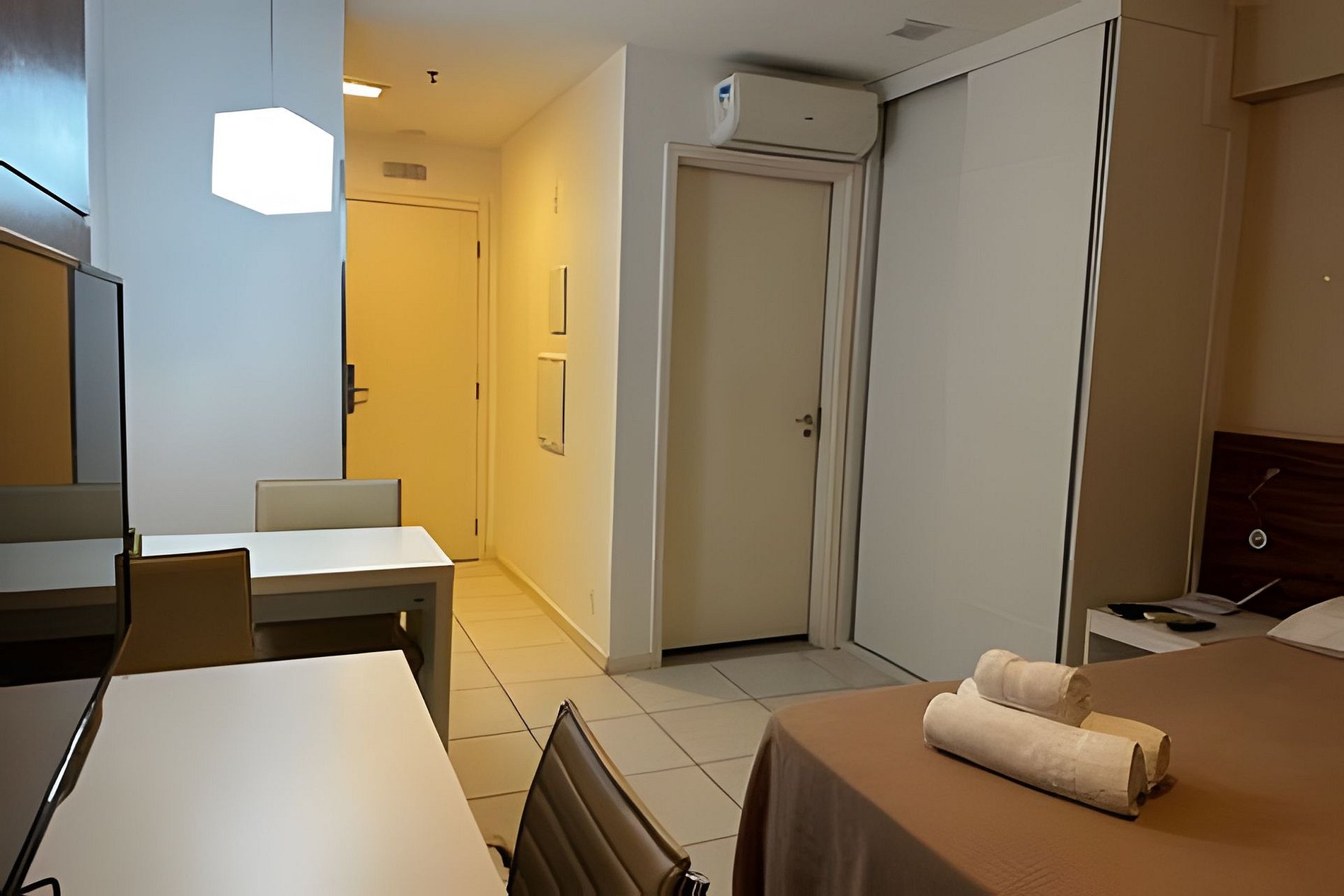 O Espaço: Quarto aconchegante com cama de casal e decoração contemporânea, projetado para proporcionar o máximo de conforto e descanso. Aprecie a vista panorâmica da cidade diretamente do apartamento. Cozinha funcional completamente equipada com eletrodomésticos modernos, incluindo geladeira, fogão, geladeira, micro-ondas, liquidificador e sanduicheira, permitindo que você prepare suas refeições com facilidade. Wi-Fi de alta velocidade e ar-condicionado garantem uma estadia conectada e confortável.