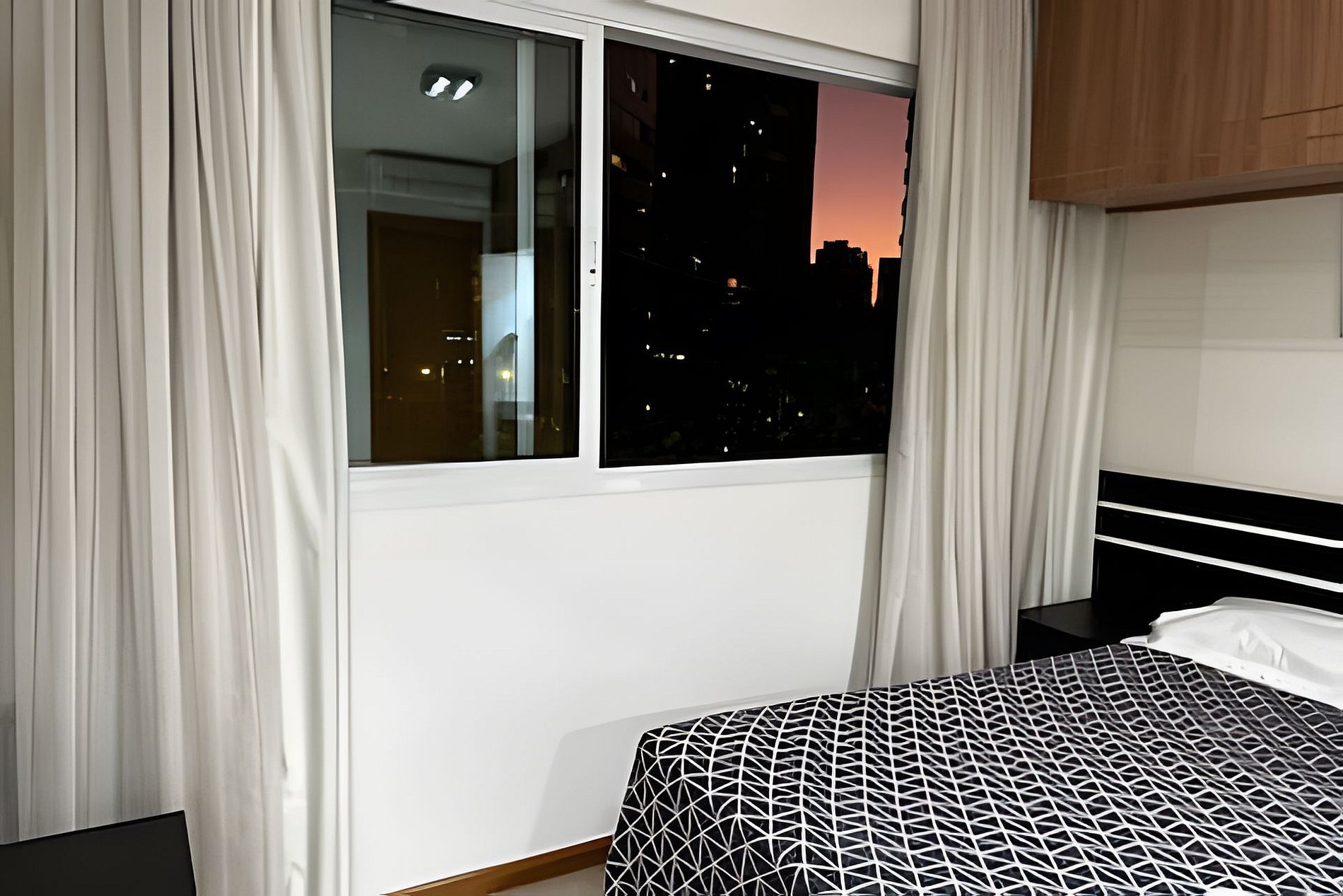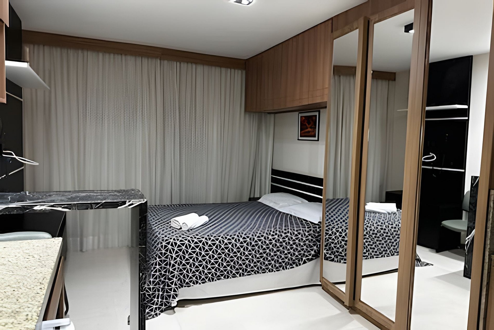 O Espaço: Quarto com cama tamanho queen. A decoração moderna proporciona uma experiência de hospedagem única e relaxante. A vista panorâmica para o proporciona a sensação perfeita para começar o dia ou relaxar à noite. Cozinha equipada com geladeira, fogão, micro-ondas, liquidificador e sanduicheira para preparar suas refeições. O apartamento disponibiliza Wi-Fi de alta velocidade e ar-condicionado para seu máximo conforto.