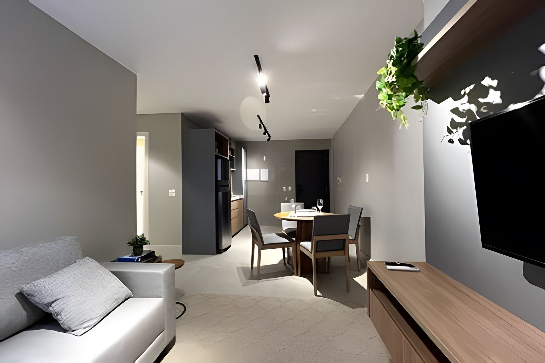 Apartamento de 2 quartos, com sala, cozinha e banheiro.