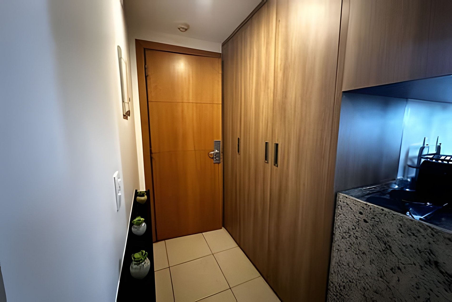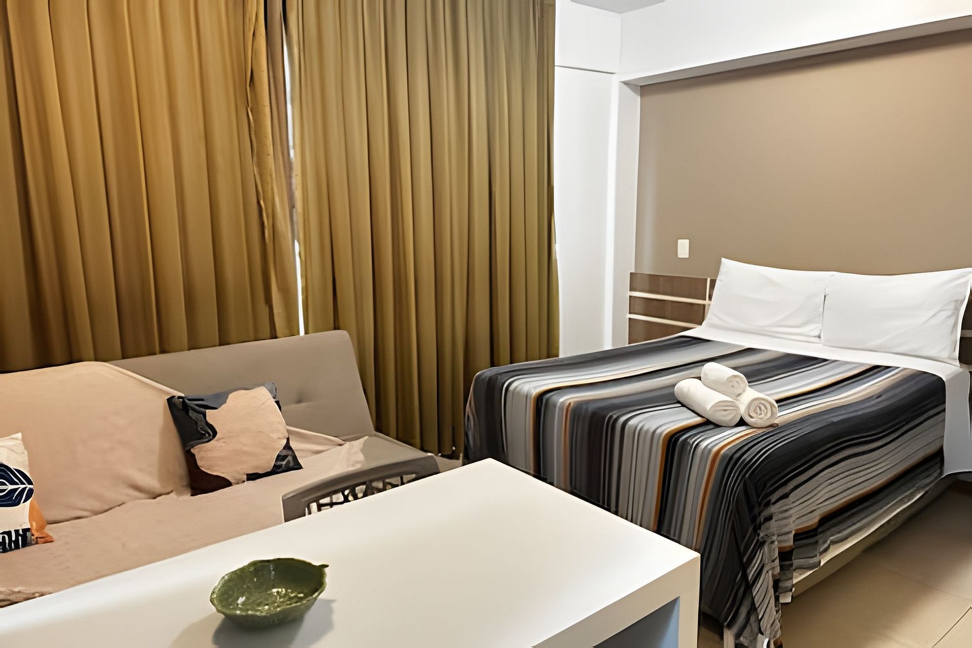O Espaço: Quarto com cama tamanho queen e sofá-cama de casal. A decoração moderna proporciona uma experiência de hospedagem única e relaxante. A vista panorâmica da cidade proporciona a sensação perfeita para começar o dia ou relaxar à noite. Cozinha equipada com geladeira, fogão, micro-ondas, liquidificador e sanduicheira para preparar suas refeições. O apartamento disponibiliza Wi-Fi de alta velocidade e ar-condicionado para seu máximo conforto.